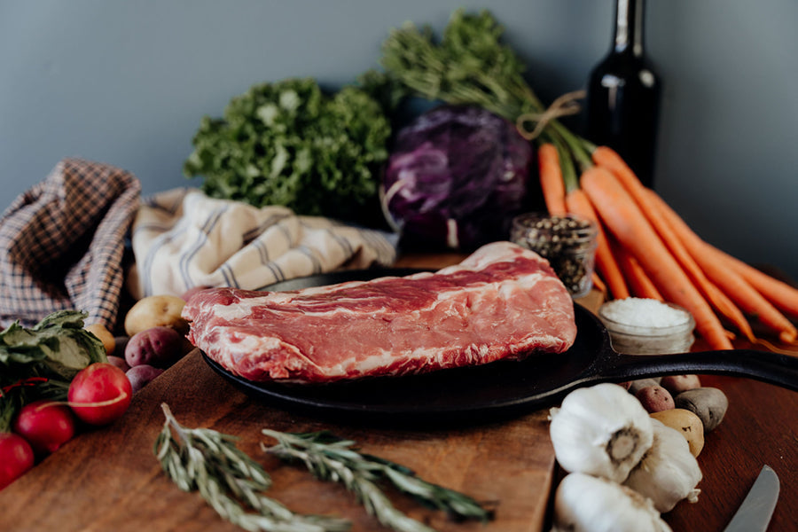 US Wellness Meats pigs are pasture-raised on family farms. They spend their entire lives roaming and rooting in green pastures. Pigs are foragers, and our pigs are outdoors every day (weather permitting) to forage for bugs, sticks, roots, etc. Since pigs have a single stomach, unlike the four-chambered stomach of cattle, we cannot raise a healthy animal on grass alone, so their diets are supplemented with non-GMO grains. They have never been administered antibiotics or added growth hormones.