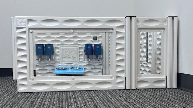 The EZwhelp EZclassic Mess Hall is the perfect solution for breeders that are looking for a little bits of everything when adding an extra room on to their whelping area. The 3-walled Mess Hall attaches to your whelping box and provides a 2nd room complete with a Water & Food Station Panel Set, an extra Front Panel w/Doors Set, and Window Panel wall to provide easy viewing into and out of the area.