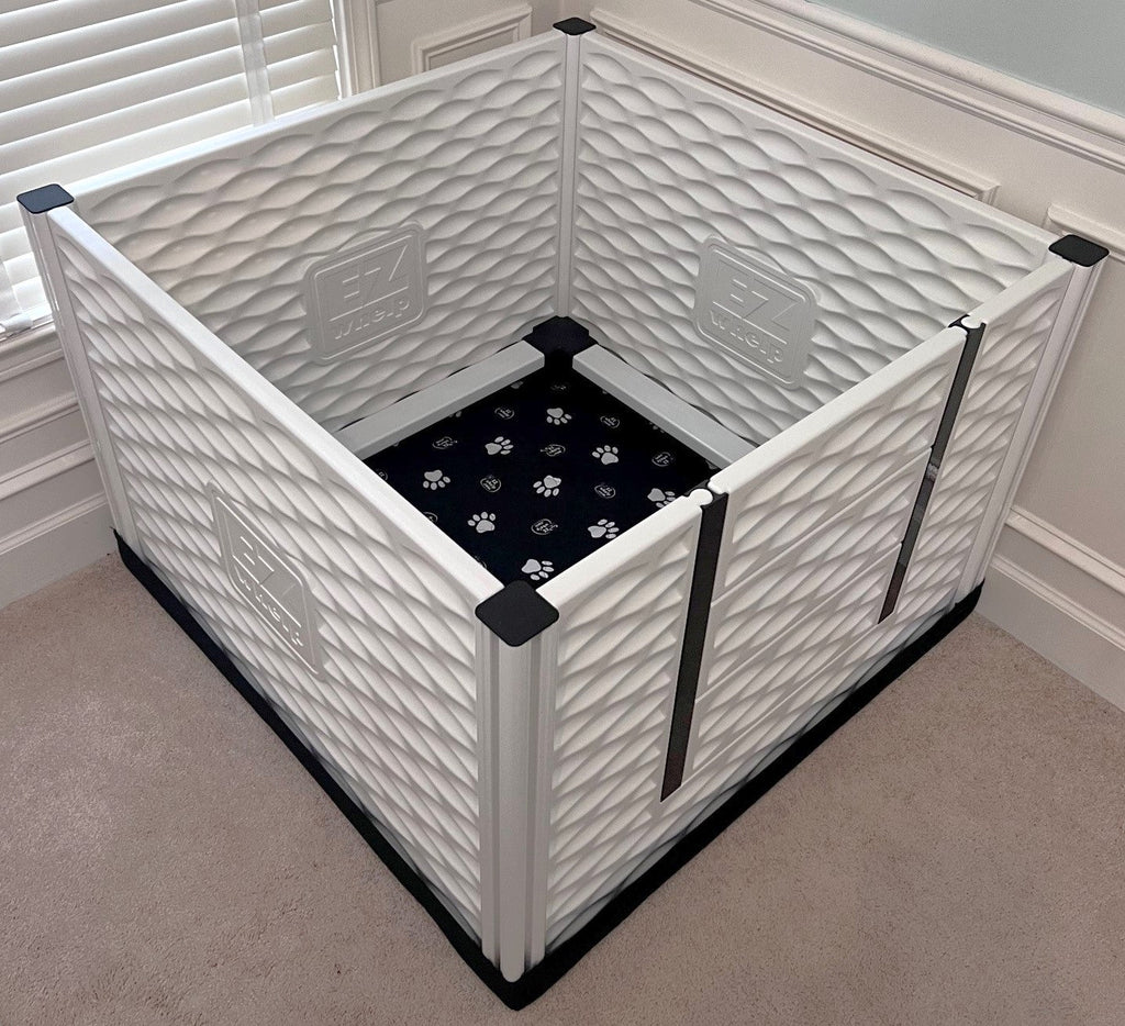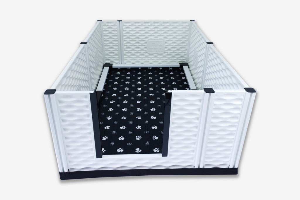 The award winning EZclassic Tall (28" height) Whelping Box is sold complete with our rail assembly, front panel with 3 piece door, TWO washable/reusable absorbent pads (one gray/one black), and one heavy duty canvas floor liner. Wall panel height = 28 inches. (U.S. Patent No. D971511/US Patent Design D1019004)