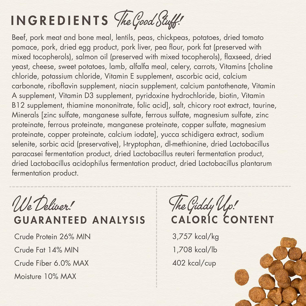 Beef, Pork Meat Meal, Peas, Lentils, Chickpeas, Potatoes, Dried Tomato Pomace, Dried Whole Egg, Pork Liver, Pork Fat, Salmon Oil, Flaxseed, Lamb, Cheese, Sweet Potatoes, Brewers Dried Yeast, Alfalfa Meal, Carrots, Lettuce, Celery, Potassium Chloride, Salt, Chicory Root Extract, Taurine, Yucca Schidigera Extract, L-Tryptophan, DL-Methionine, Sodium Selenite, Sorbic Acid (Preservative), Vitamins, Minerals, Probiotics.