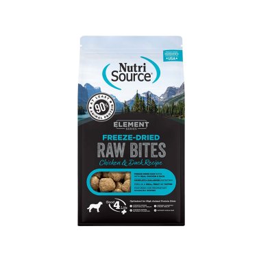 At family-owned NutriSource® we believe the secret to health is successful digestion and absorption of balanced nutrition. NutriSource Element Series Freeze Dried Raw Bites is specially formulated with the NutriSource Good 4 Life + System and the best elements of nature, packed with protein, and freeze dried to preserve nutrients and flavor. Use it as a nutrient boosting topper, a deliciously healthy treat, or add a splash of NutriSource Come-Pooch-A for a tasty and refreshing meal your dog will love. Perfect for use at home or on the go.