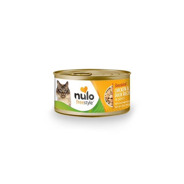 Nulo FreeStyle Cat Shredded Chicken & Duck canned food is full of real-meat protein to help your cat maintain lean muscles without any excess calories. It contains NO grains, carrageenan, meat by-products, corn, wheat, soy or artificial preservatives, colors or flavoring. Complementary protein duo features chicken and duck as top ingredients for the animal protein and flavor your little carnivore craves Packed with whole-body health nutrients like vitamins, minerals, omegas and essential taurine for overall well-being Zero grains, carrageenan, meat by-products, corn, wheat, soy or artificial preservatives, colors or flavoring Keeps your kitty hydrated with plenty of moisture from broth-based gravy, and has an irresistible texture cats love Made in the USA and comes in conveniently portioned, easy-open cans to make mealtime easy and hassle-free