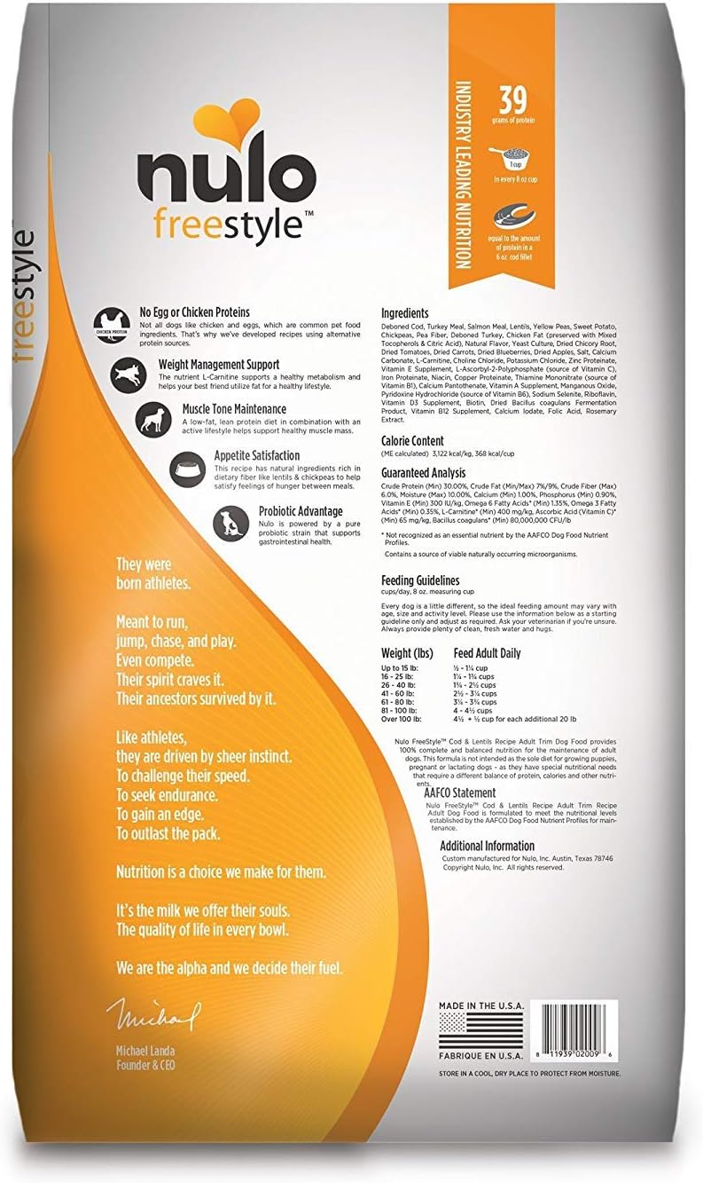 Deboned Cod, Turkey Meal, Salmon Meal, Lentils, Yellow Peas, Sweet Potato, Chickpeas, Pea Fiber, Deboned Turkey, Chicken Fat (preserved with Mixed Tocopherols & Citric Acid), Natural Flavor, Yeast Culture, Dried Chicory Root, Dried Tomatoes, Dried Carrots, Dried Blueberries, Dried Apples, Salt, Calcium Carbonate, L-Carnitine, Choline Chloride, Potassium Chloride, Zinc Proteinate, Vitamin E Supplement, L-Ascorbyl-2-Polyphosphate (source of Vitamin C), Iron Proteinate, Niacin, Copper Proteinate, Thiamine Mononitrate (source of Vitamin B1), Calcium Pantothenate, Vitamin A Supplement, Manganous Oxide, Pyridoxine Hydrochloride (source of Vitamin B6), Sodium Selenite, Riboflavin, Vitamin D3 Supplement, Biotin, Dried Bacillus coagulans Fermentation Product, Vitamin B12 Supplement, Calcium Iodate, Folic Acid, Rosemary Extract.