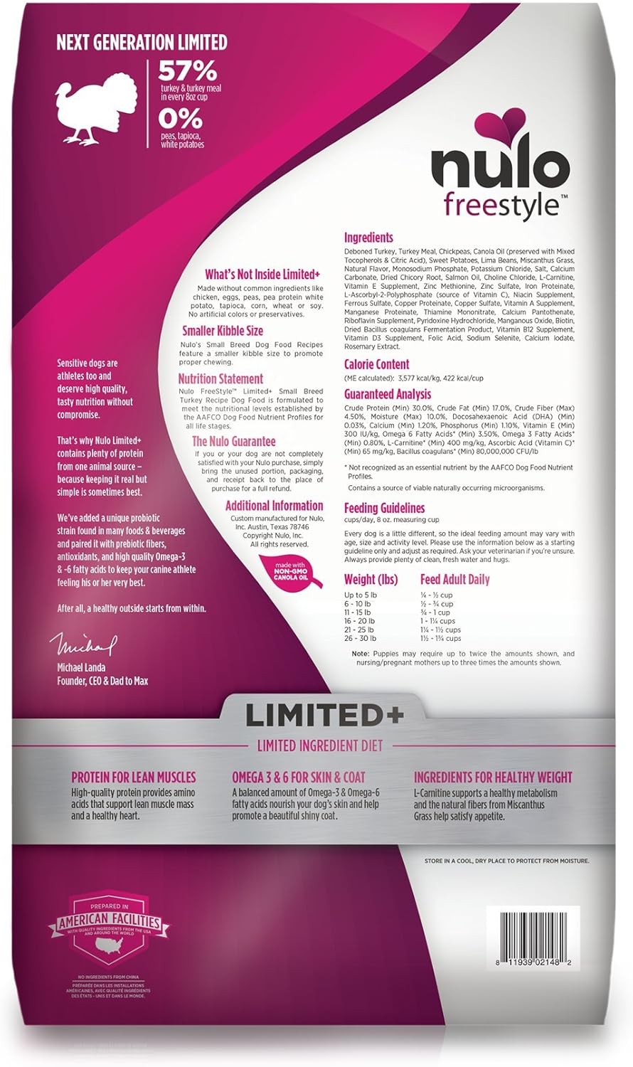 Deboned Turkey, Turkey Meal, Chickpeas, Canola Oil (preserved with Mixed Tocopherols & Citric Acid), Sweet Potatoes, Lima Beans, Miscanthus Grass, Natural Flavor, Monosodium Phosphate, Potassium Chloride, Salt, Calcium Carbonate, Dried Chicory Root, Salmon Oil, Choline Chloride, L-Carnitine, Vitamin E Supplement, Zinc Methionine, Zinc Sulfate, Iron Proteinate, L-Ascorbyl-2-Polyphosphate (source of Vitamin C), Niacin Supplement, Ferrous Sulfate, Copper Proteinate, Copper Sulfate, Vitamin A Supplement, Manganese Proteinate, Thiamine Mononitrate, Calcium Pantothenate, Riboflavin Supplement, Pyridoxine Hydrochloride, Manganous Oxide, Biotin, Dried Bacillus coagulans Fermentation Product, Vitamin B12 Supplement, Vitamin D3 Supplement, Folic Acid, Sodium Selenite, Calcium Iodate, Rosemary Extract.