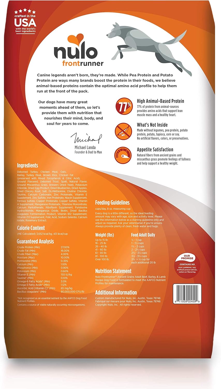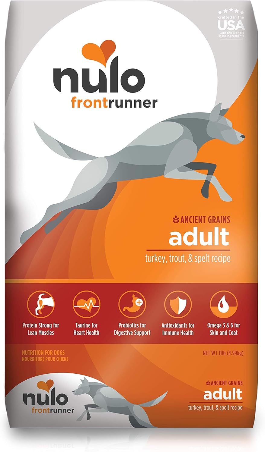 Deboned Turkey, Chicken Meal, Oats, Barley, Turkey Meal, Brown Rice, Chicken Fat (preserved with Mixed Tocopherols & Citric Acid), Ground Flaxseed, Deboned Trout, Spelt, Natural Flavor, Ground Miscanthus Grass, Brewers Dried Yeast, Potassium Chloride, Dried Egg Product, Dried Blueberries, Dried Apples, Dried Chicory Root, Salt, DL-Methionine, Choline Chloride, Taurine, Calcium Carbonate, Zinc Proteinate, Vitamin E Supplement, Zinc Sulfate, Iron Proteinate, Niacin Supplement, Ferrous Sulfate, Copper Proteinate, Copper Sulfate, Vitamin A Supplement, Manganese Proteinate, Thiamine Mononitrate, Calcium Pantothenate, Riboflavin Supplement, Pyridoxine Hydrochloride, Manganous Oxide, Biotin, Dried Bacillus coagulans Fermentation Product, Vitamin B12 Supplement, Vitamin D3 Supplement, Folic Acid, Sodium Selenite, Calcium Iodate, Rosemary Extract.