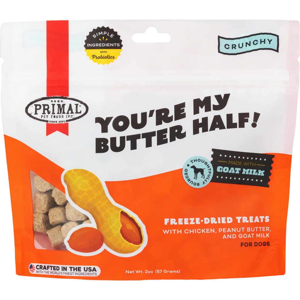 Give your butter half something to bark about with thoughtfully-sourced chicken, nutty peanut butter, goat milk, and gut-supporting probiotics.