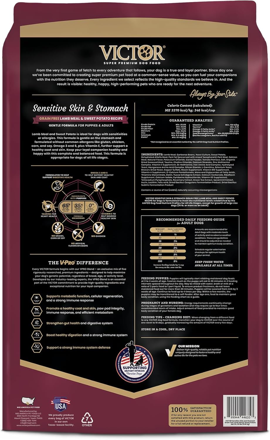 Lamb Meal, Garbanzo Beans, Yeast Culture, Sweet Potato, Dehydrated Alfalfa Meal, Pork Fat (preserved with mixed Tocopherols), Pork Meal, Salmon Meal, Natural Flavor, Potassium Chloride, Carrot Powder, Tomato Pomace, Salt, Organic Dried Seaweed Meal, Taurine, Choline Chloride, Calcium Stearate, Zinc Methionine Complex, Vitamin E Supplement, DL-Methionine, Iron Amino Acid Complex, Hydrolyzed Yeast, Manganese Amino Acid Complex, Silicon Dioxide, L-Carnitine, Selenium Yeast, Brewers Dried Yeast, Copper Sulfate, Niacin Supplement, Vitamin B12 Supplement, Vitamin A Supplement, D-Calcium Pantothenate, Mono and Diglycerides of Fatty Acids, Thiamine Mononitrate, Biotin, Yucca Schidigera Extract, Calcium Carbonate, Riboflavin Supplement, Calcium Iodate, Pyridoxine Hydrochloride, Vitamin D3 Supplement, Tetrasodium Pyrophosphate, Rosemary Extract, Green Tea Extract, Spearmint Extract, Inulin, Lecithin, Folic Acid, Dried Bacillus Coagulans Fermentation Product, Dried Bacillus Subtilis Fermentation Product