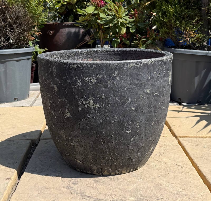 The Large Big Egg Pot measures 19 inches Across 47 in diameter and 39 inches in height, showcasing a unique green and black bubble finish. Its egg-shaped design makes it an ideal choice for housing small trees and shrubs, offering a stylish and functional planter for your greenery.