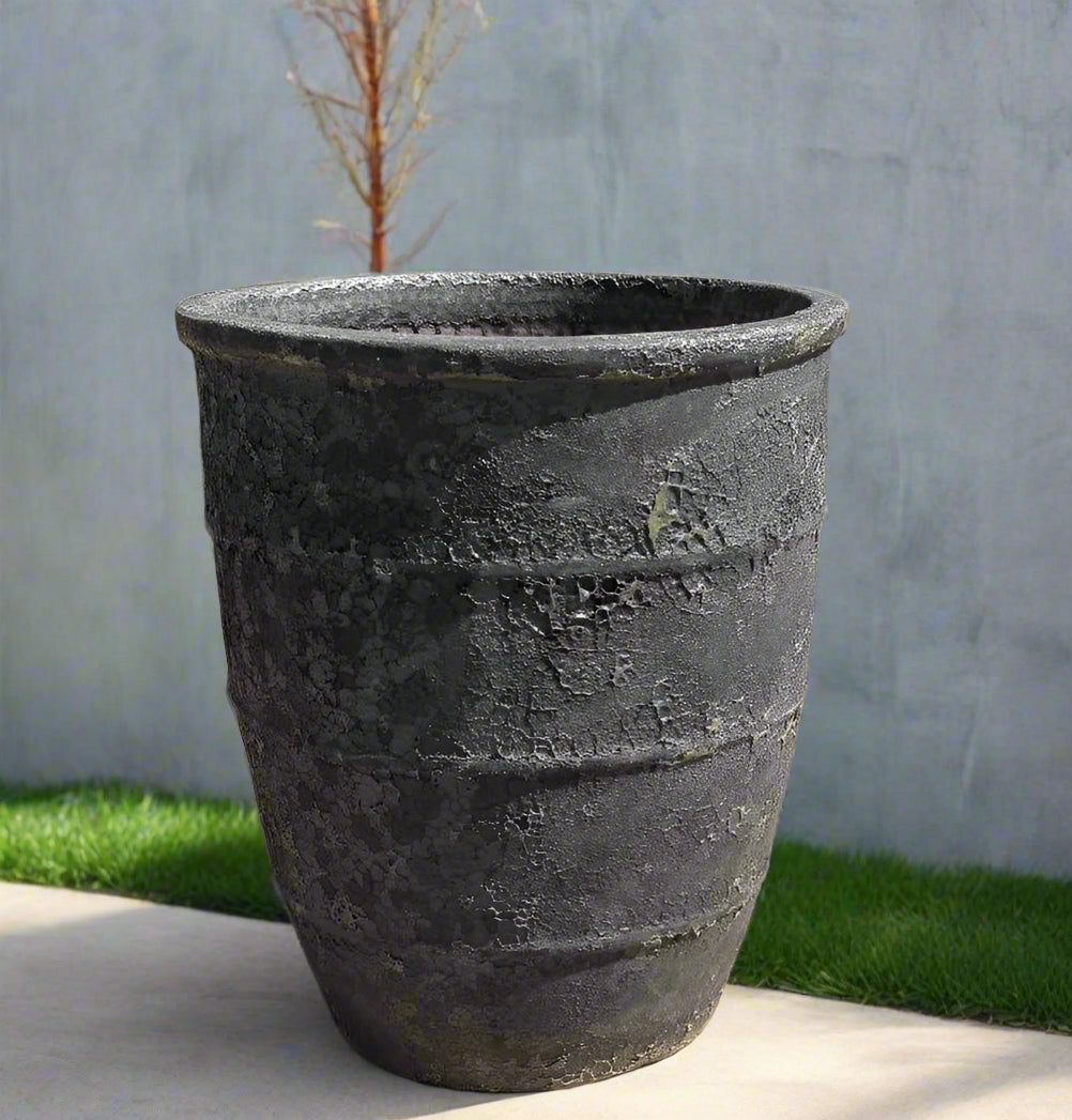 This Extra Large Tall Three Ring Pot measures 19 inches across 48 inches in diameter and 55 inches in height, offering ample space for your plants to thrive. Featuring a stylish bubble black and Verdi finish, it adds a modern touch to any indoor or outdoor setting. Its tall design supports healthy root growth, making it ideal for larger plants or decorative arrangements.